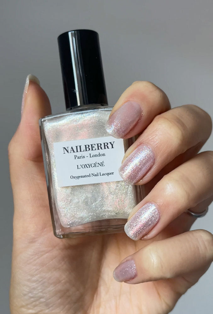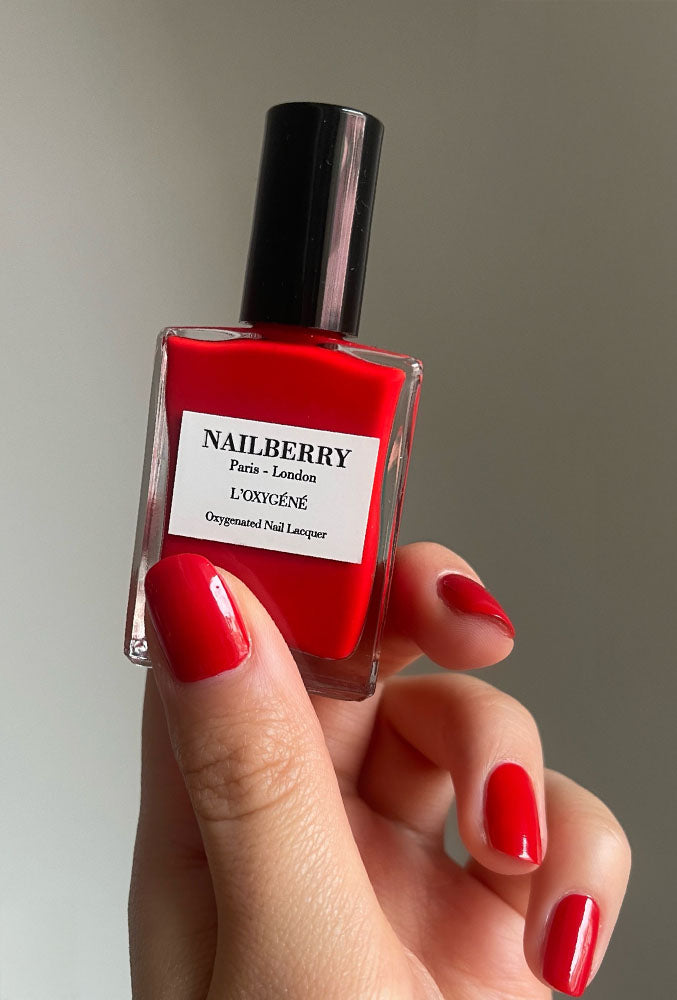 Dip brush into chosen L’Oxygéné Colour, remove excess from brush, then apply one thin layer to each nail. Allow 2-3 minutes to dry, then apply a second thin layer to each nail and allow to dry.