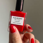 3. Appliquez une fine couche du vernis Nailberry de votre choix à l'aide de notre pinceau large et effilé pour recouvrir parfaitement votre ongle de la base à la pointe. Travaillez sur les deux mains pour permettre à chaque couche de sécher.