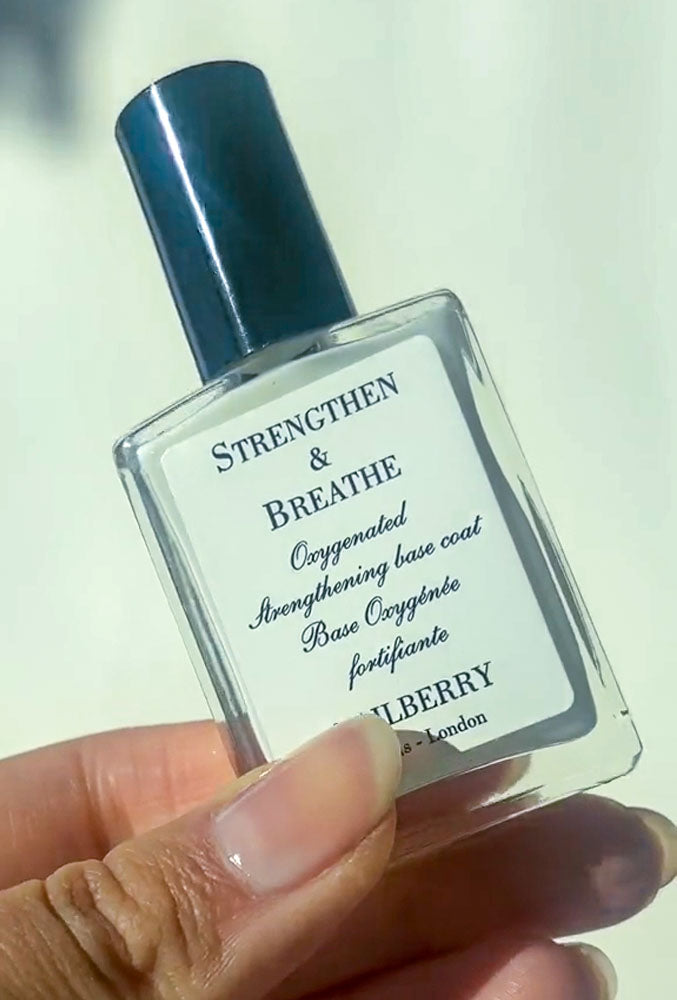 2. Limez et polissez vos ongles pour lisser les zones inégales et obtenir la longueur souhaitée, puis appliquez une couche de base Strengthen & Breathe – notre formule fortifiée mais respirante pour aider à renforcer l'ongle.