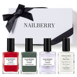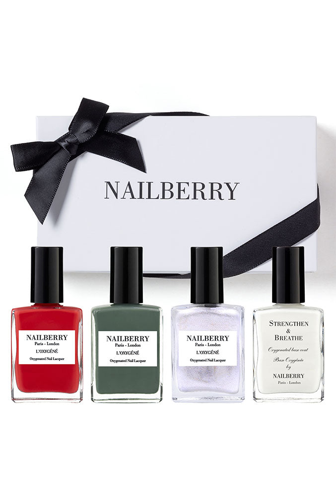 Vous y trouverez 3 vernis, notre 'rouge parfait' si convoité, un vert kaki profond et un argent semi-transparent scintillant, ainsi que notre base coat fortifiante et primée.