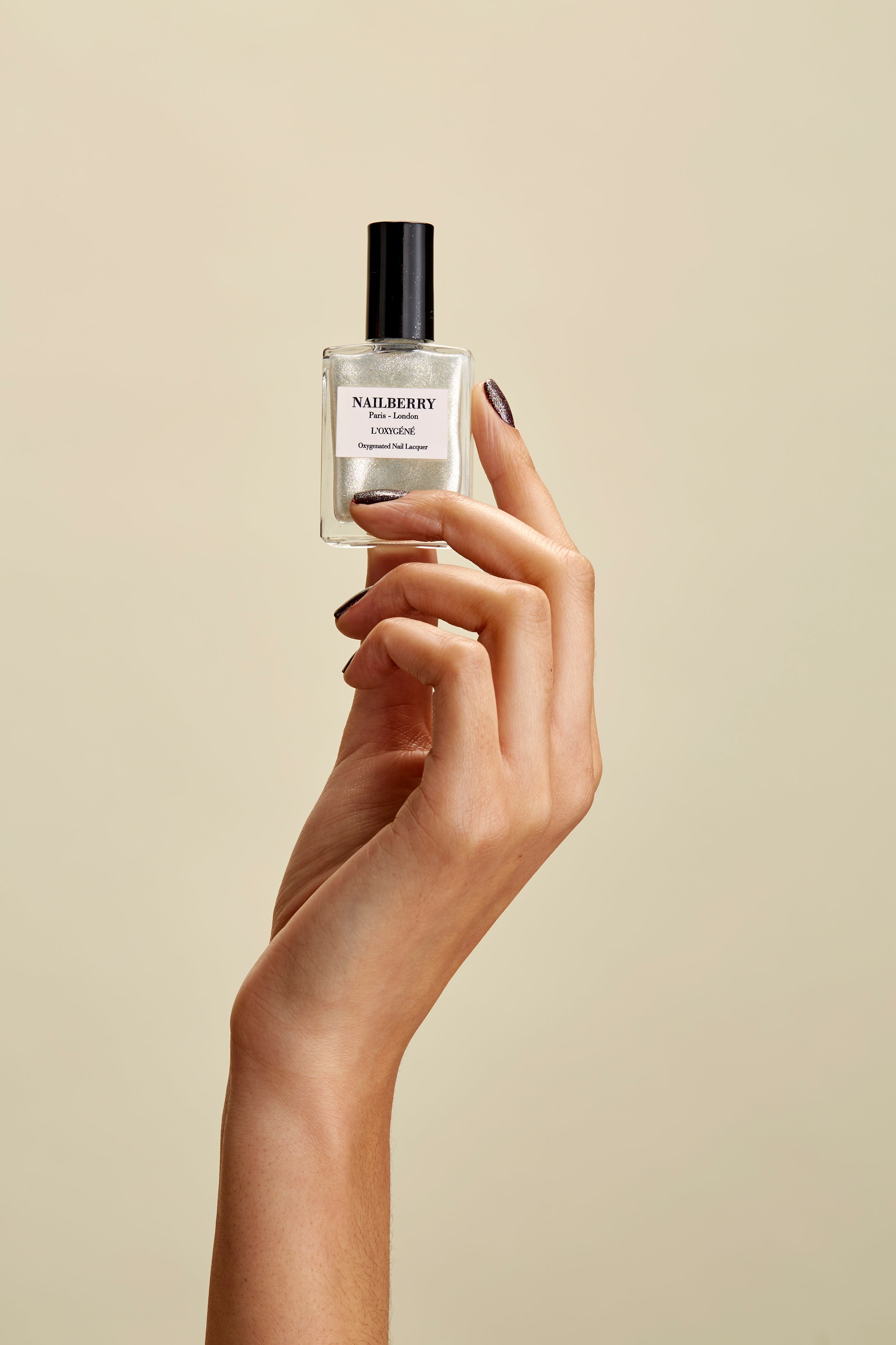 Dip brush into chosen L’Oxygéné Colour, remove excess from brush, then apply one thin layer to each nail. Allow 2-3 minutes to dry, then apply a second thin layer to each nail and allow to dry.